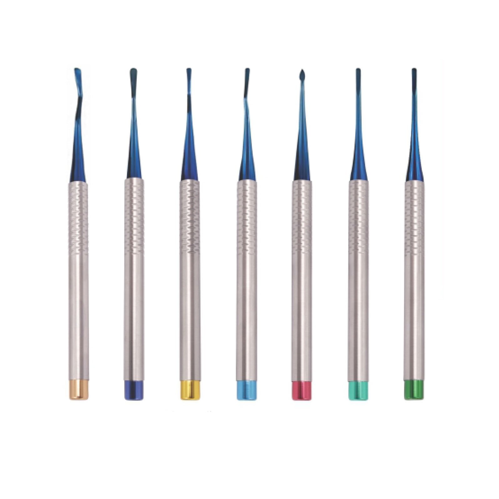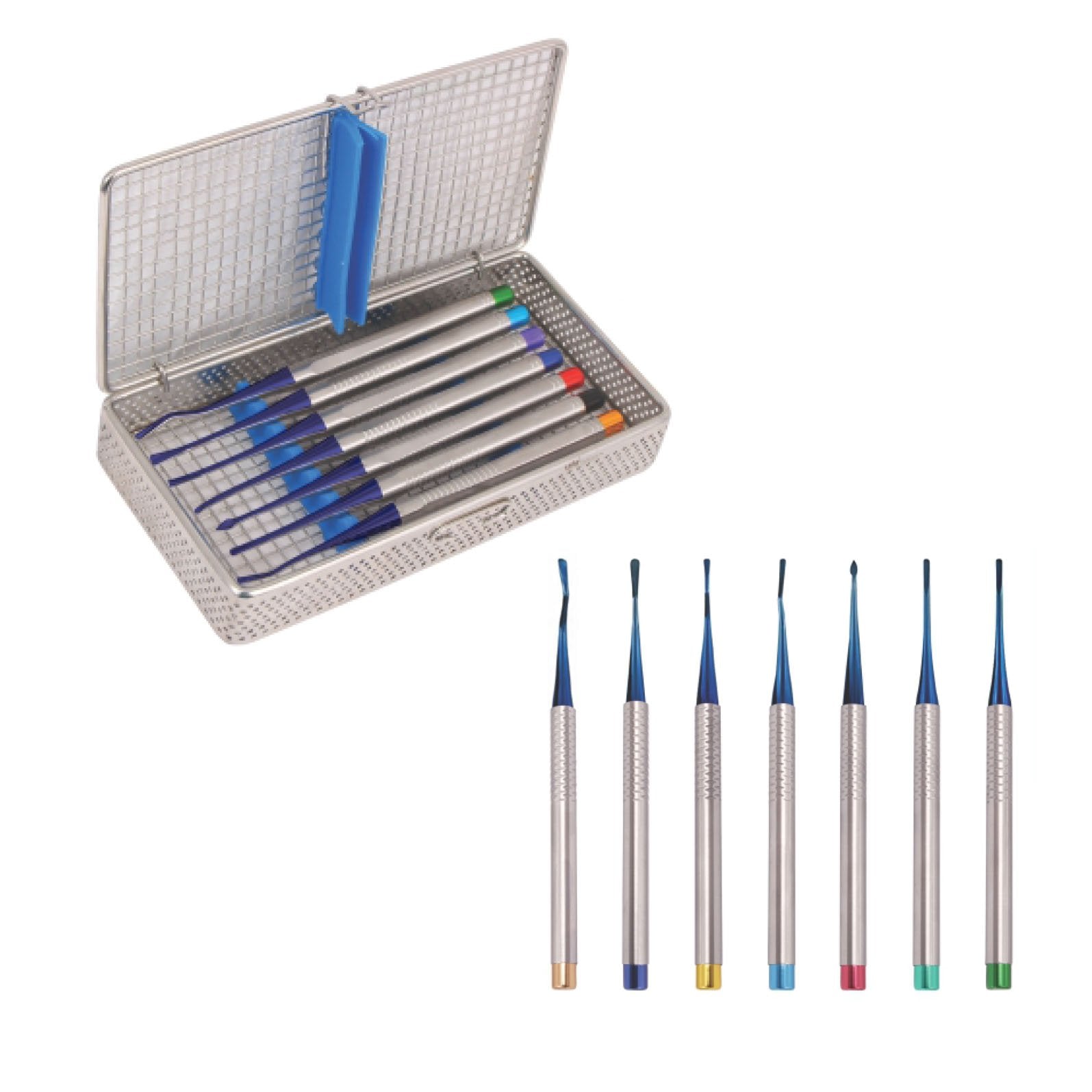 Kit de luxateurs plaqués titane, 7 pièces. Les luxateurs coupent le ligament parodontal grâce à une lame fine et tranchante qui compresse l'alvéole, coupe la membrane et déloge la dent sans dommages, permettant de garder un bon site implantaire. Possèdent des micro rainures fines. Plaqué en titane bleu pour plus de solidité et une meilleure durabilité. Stérilisable et désinfectable.