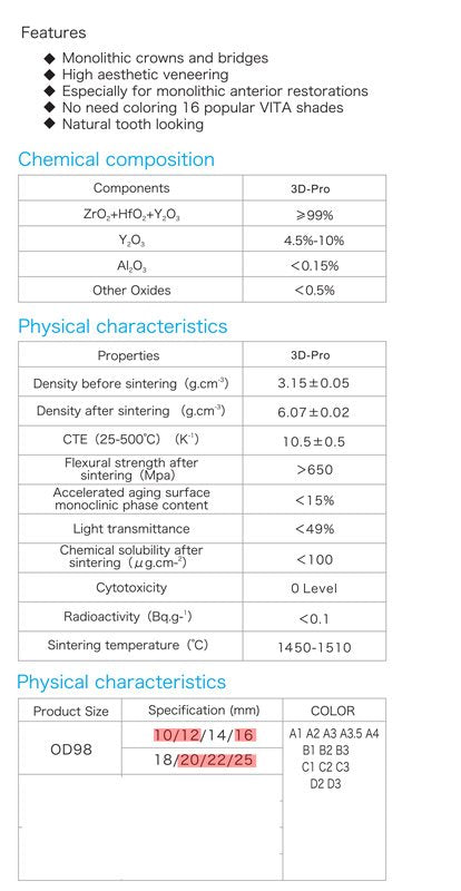 Zirconia disc in shade D diameter 98 mm 3DSAFE-PRO
