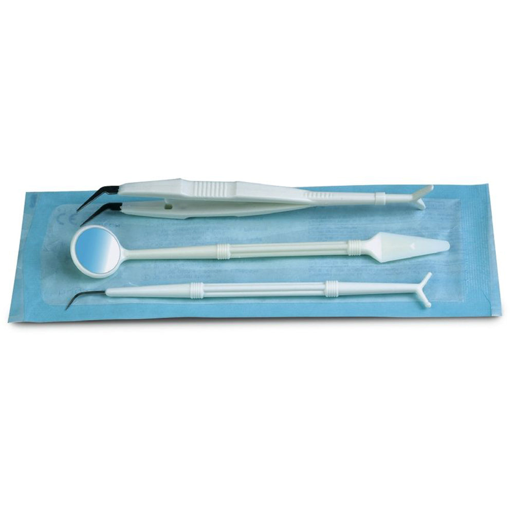 Le kit comprend : 1 miroir avec spatule de mélange - 1 précelle avec brunissoir - 1 sonde exploration avec fouloir et spatule de Heidemann.