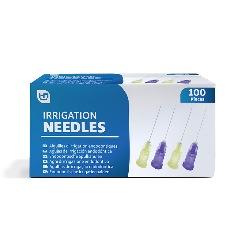 Aiguilles d'irrigation endocanalaires et parodontales, à bout mousse et ouverture latérale. L'ouverture latérale évite que le liquide de rinçage sous pression irrite le desmodonte.