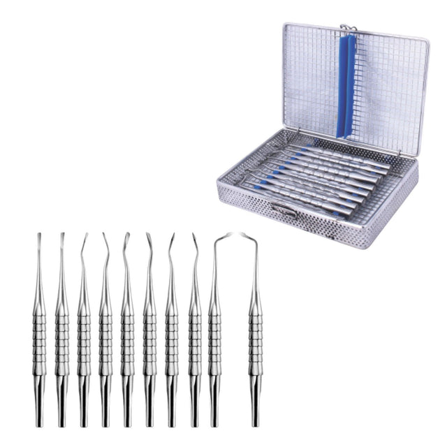 Kit de luxateurs contenant 10 pièces. Les luxateurs coupent le ligament parodontal grâce à une lame fine et tranchante qui compresse l'alvéole, coupe la membrane et déloge la dent sans dommages, permettant de garder un bon site implantaire. Stérilisable et désinfectable.